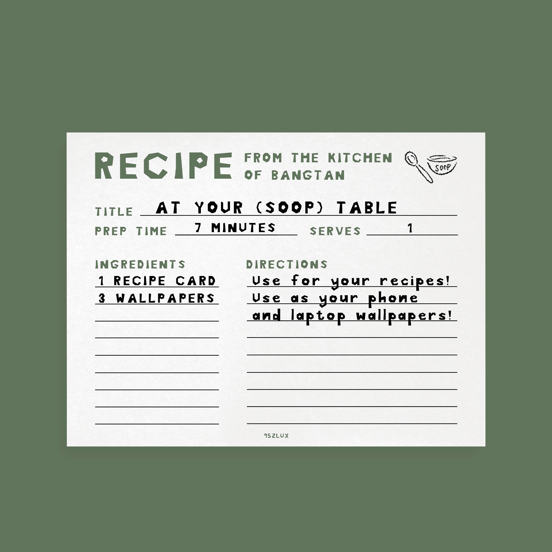 includes: 1 printable bangtan soop recipe card, 2 iphone wallpapers, 1 laptop/desktop wallpaper 🥄 / for personal use ONLY. do not reproduce, repost, claim as your own, or sell. thank you so much!!