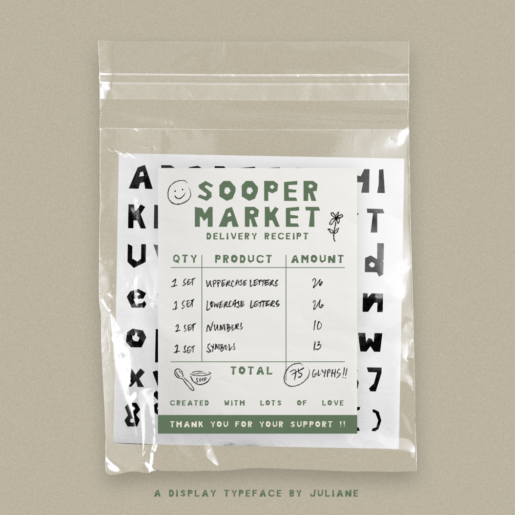 Sooper is an original sans serif display typeface inspired by cut out paper letters that are occasionally used for traditional collages. It is a regular display typeface in TTF format that comes with 75 glyphs. 🌳